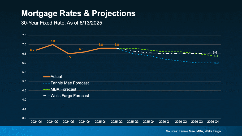 According to the latest forecasts, rates aren’t expected to fall dramatically anytime soon. Most experts project they’ll stay somewhere in the mid-to-low 6% range through 2026 (see graph below):