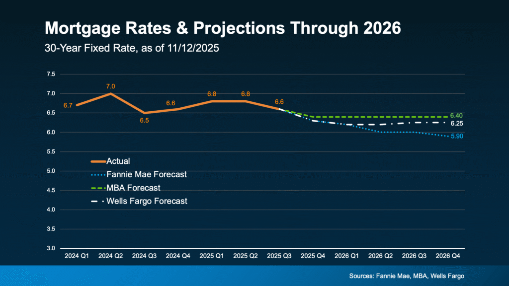 For starters, most experts say mortgage rates are likely to stay pretty much where we are today throughout 2026. So, there’s no guarantee we’ll see a rate much lower than what we have now. Only one expert forecaster is saying rates could fall into the upper 5s next year (see graph below):